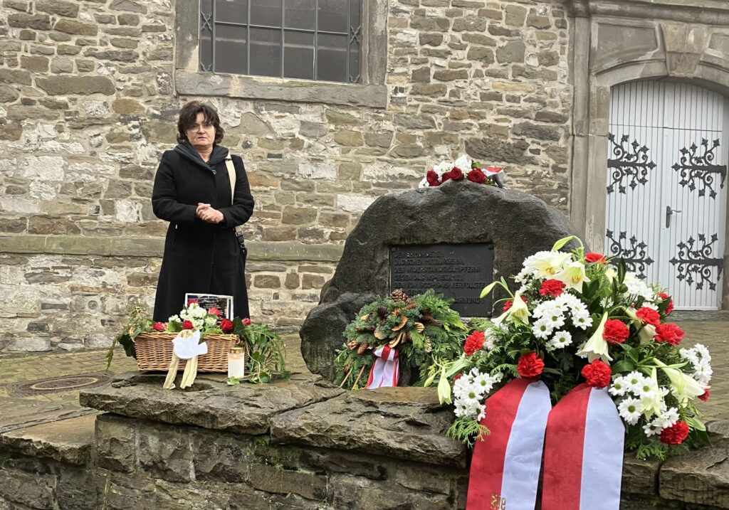 Am Anschluss an diesen Teil der Veranstaltung legte die zweite stellvertretende Bürgermeisterin, Frau Dr. Esther Kanschat, für die Stadt Velbert einen Kranz an der Gedenkstelle am Offers nieder.